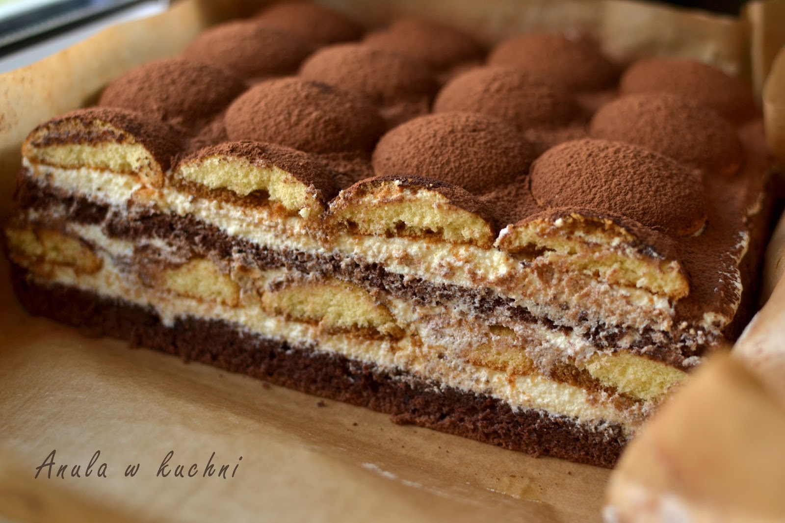 - Biszkopt przekroić wzdłuż na pół. Pierwszy blat nawilżyć ok 1/4 ponczu. Wyłożyć 1/3 masy. Biszkopty nawilżyć kolejną częścią ponczu i układać na masie. Posypać kakao. Drugi biszkopt posmarować cienko masą i tą posmarowaną stroną przykryć ciastka. Wierzch biszkoptu naponczować.